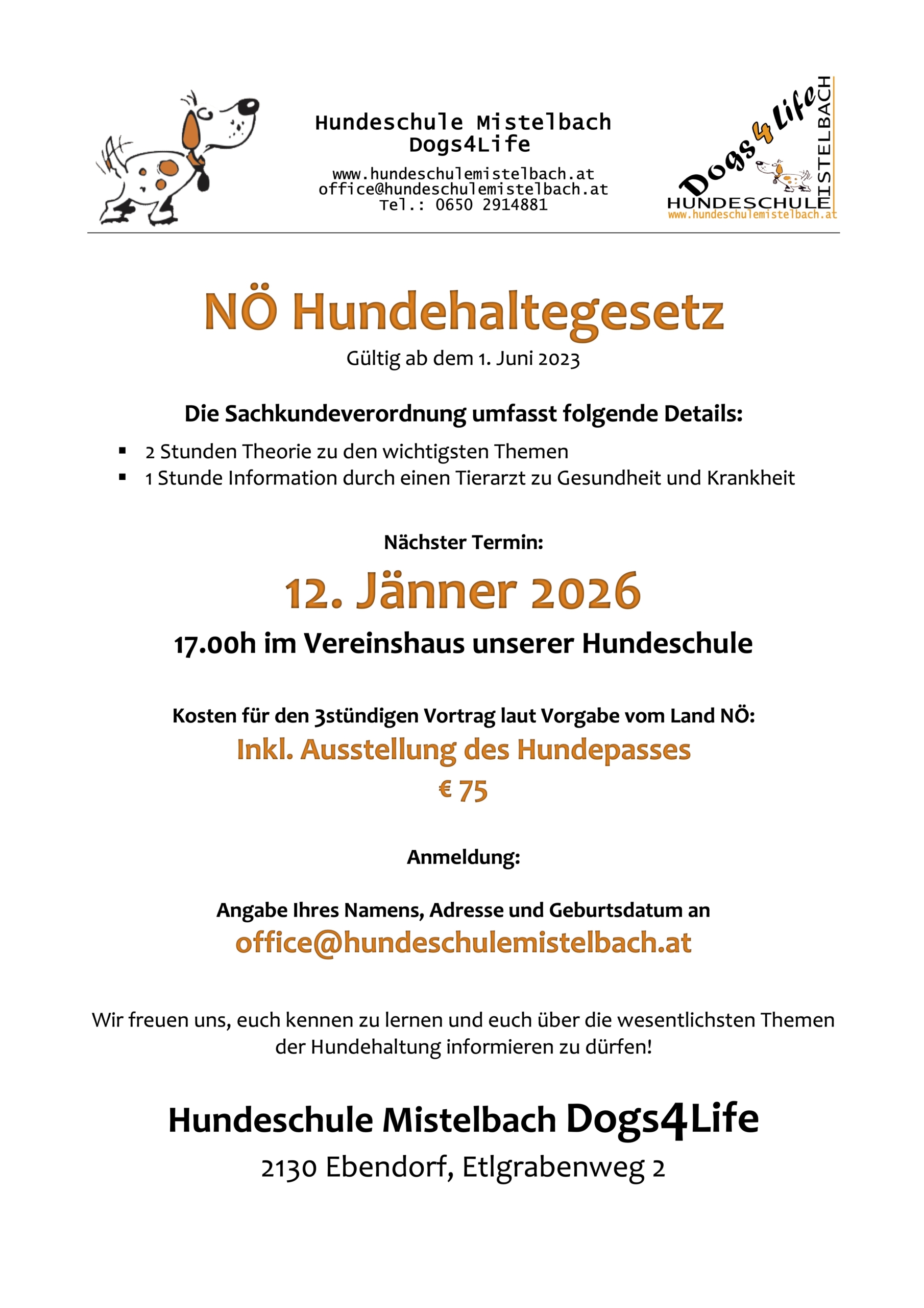 NÖ Hundepass 12. Jänner 2026 01.11.2025 | Vom Land NÖ vorgeschrieben bei der Neuanmeldung eines Hundes – es erwartet euch ein äußerst informativer Abend! PDF: Hundepass Flyer_12012