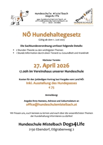 Zur Erlangung des erweiterten NÖ Sachkundenachweises für gelistete Hunde ist sowohl Theorie (zusätzlich zum Hundepass) als auch Praxistraining nötig.