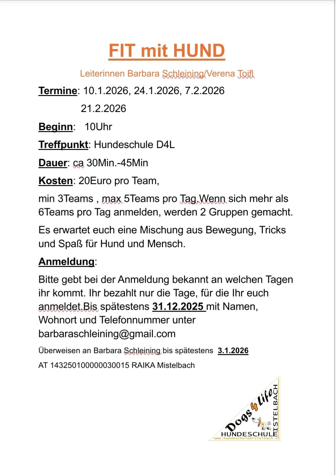 Bei diesem spannenden Workshop erwarten euch viele Übungen, die euch und euren Hund auch in der Winterzeit fit halten sollen!